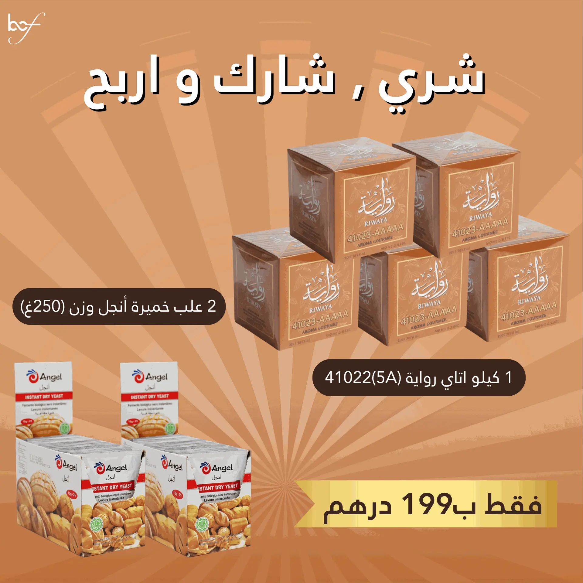 العرض واضح: 1 كيلو أتاي رواية + 2 علب خميرة أنجل 250غ، والتوصيل حتى للدار.